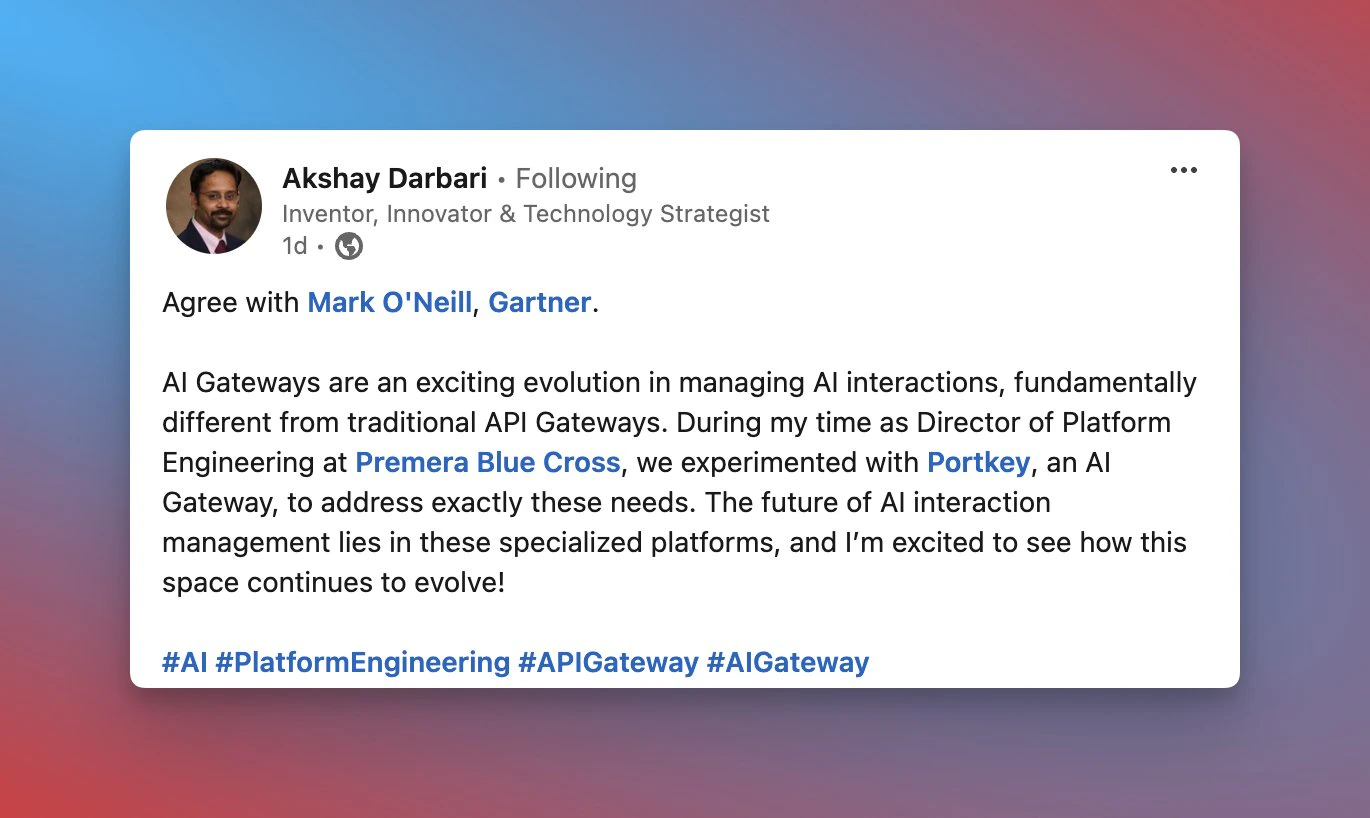 When Premera Blue Cross’ Director of Platform Engineering needed an AI Gateway, they chose Portkey. Why? Because traditional API gateways weren’t built for AI-first companies. Are you in the same boat? Schedule an expert consultation here.