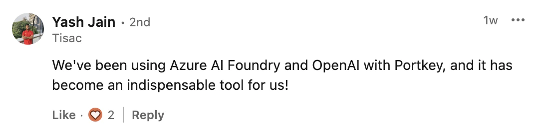 With Portkey’s deep integration into the Azure AI ecosystem (OpenAI, Foundry, APIM, Marketplace), teams can now build, scale, and govern GenAI apps without leaving their existing cloud setup. Our customers are vouching for it!